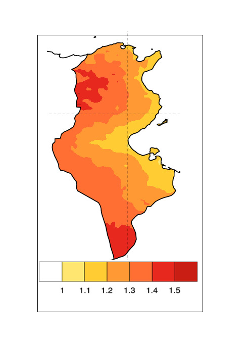 | Description en Arabe | و تتوقع النماذج العددية ارتفاع في درجات الحرارة على كامل البلاد و تكون أقل حدة على المناطق الستحلية RCP8.5اسقاطاث تغير درجات الحرارة مقارنة بالمعدلات العادية في أفق 2100 حسب السيناريو المتوسط |